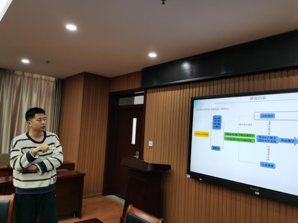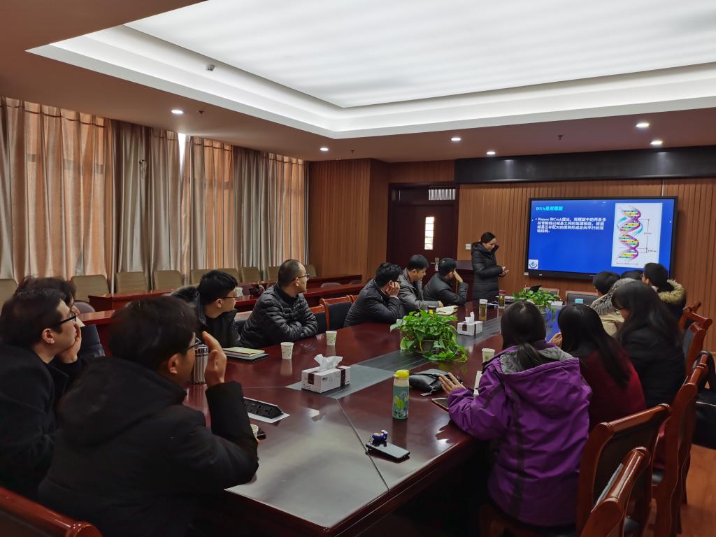 许洋洋、吴佳萍、宋晓晓、严冬、李淑芳、史永强、田瑞芬、刘新平、戴小妹、何彦平、袁大景等十一位教师分别作了题为“溶剂手性转移策略制备新型螺旋共轭聚二乙炔超分子凝胶”、“铑(III)/手性羧酸协同催化碳氢键活化合成手性氨基酸反应研究”、“不对称过渡金属催化C-N偶联去芳构化构建手性含氮杂环化合物”、“ 含复合π-共轭电子体系的有机-无机杂化硼酸盐的设计合成及非线性光学性能研究”、“ 含阳离子基团红外非线性光学晶体材料的合成与性能研究”、“ 基于氮杂环酰亚胺n-型有机半导体材料的设计、合成及性能研究”、“ 基于平行交叉DNA闭合环的拓扑结构研究”、“ 过氧化钙介导且功能自适应的一氧化氮治疗体系用于增强生物被膜的清除”、“ 基于细菌生物被膜微环境构建抗生素耐药性逆转高分子佐剂”、“ 基于纸层析的SELEX筛选适配体应用于侧流层析技术检测水体中的有机污染物”、“ 血液中肝素含量的电化学测定”的报告。分别就个人近年来科研情况和2021年国家自然科学基金申报工作进行了汇报。