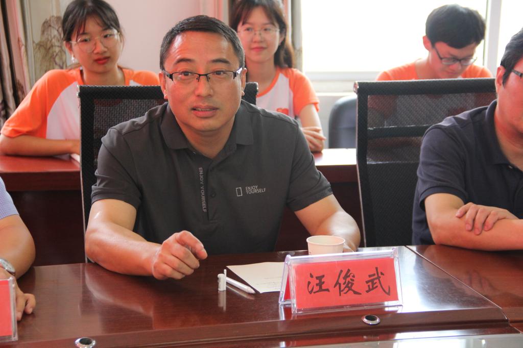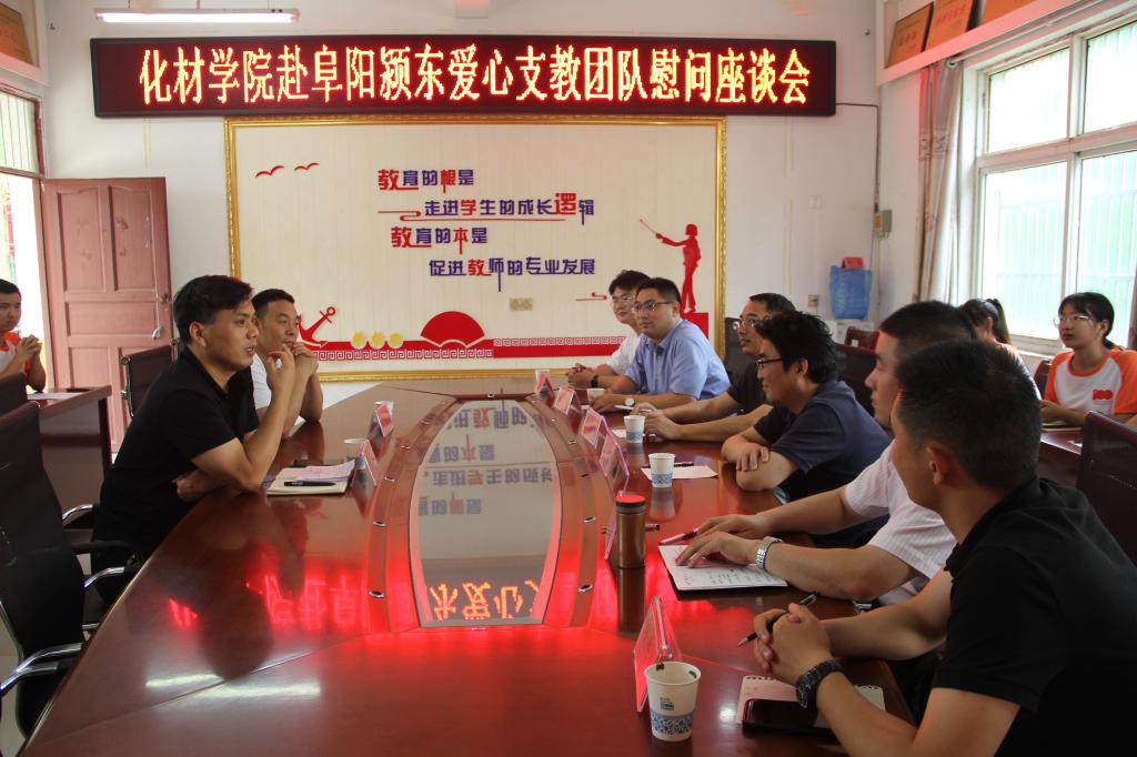 20日上午,汪俊武一行来到阜阳市颖东区新乌江镇亲切慰问了“化”雨润芽,“材”风为蕾爱心支教暑期社会实践团队,并召开师生座谈会与志愿者们进行深入交流,新乌江镇中心学校校长周凯、副校长戴宗刚及暑期社会实践队员代表共同出席了本次座谈会。