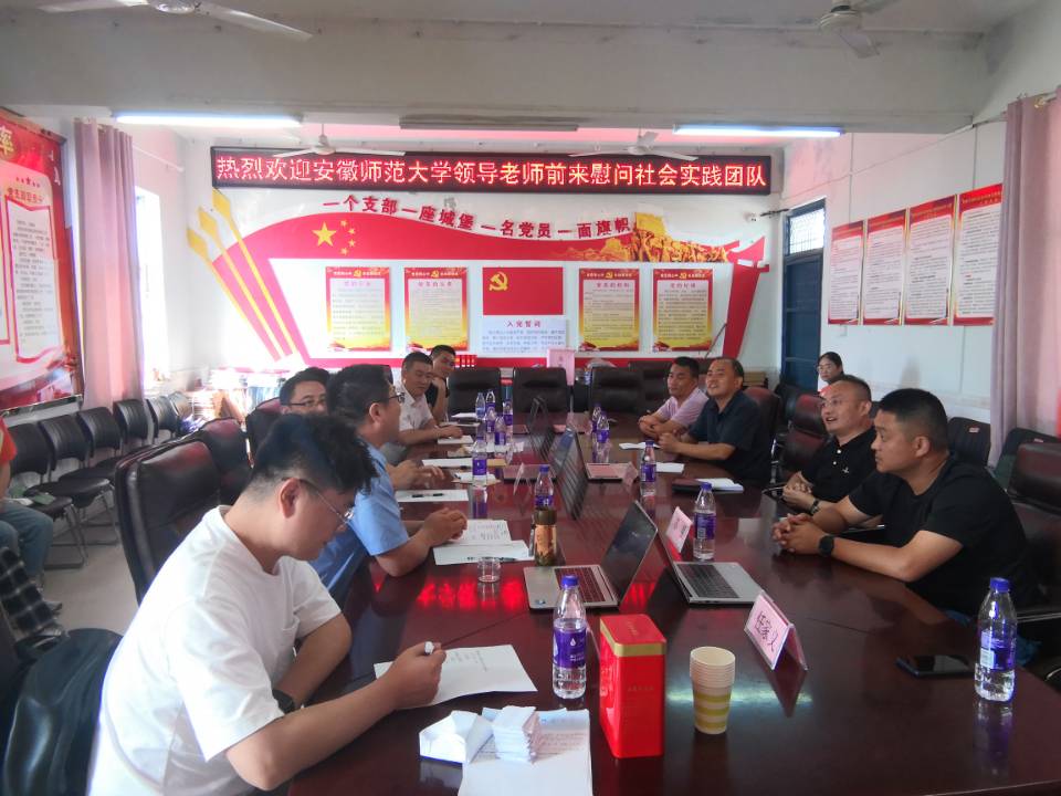 7月21日上午,汪俊武、高峰、廖仲明一行来到阜阳市颍州区袁集镇对学院“皖象更新·脱‘颍’而出”主题调研团队进行慰问,并同袁集镇党委书记李永启、镇长韩德生、党委副书记孙影、党委副书记李昊、副镇长徐若阳开展座谈交流。队长沙凝从探研脱贫成果、感受精神文明、“知民生·办实事”三个方面汇报了实践活动开展情况,安全员陈晨和宣传员王林新分别介绍了团队安全保障情况及宣传工作情。